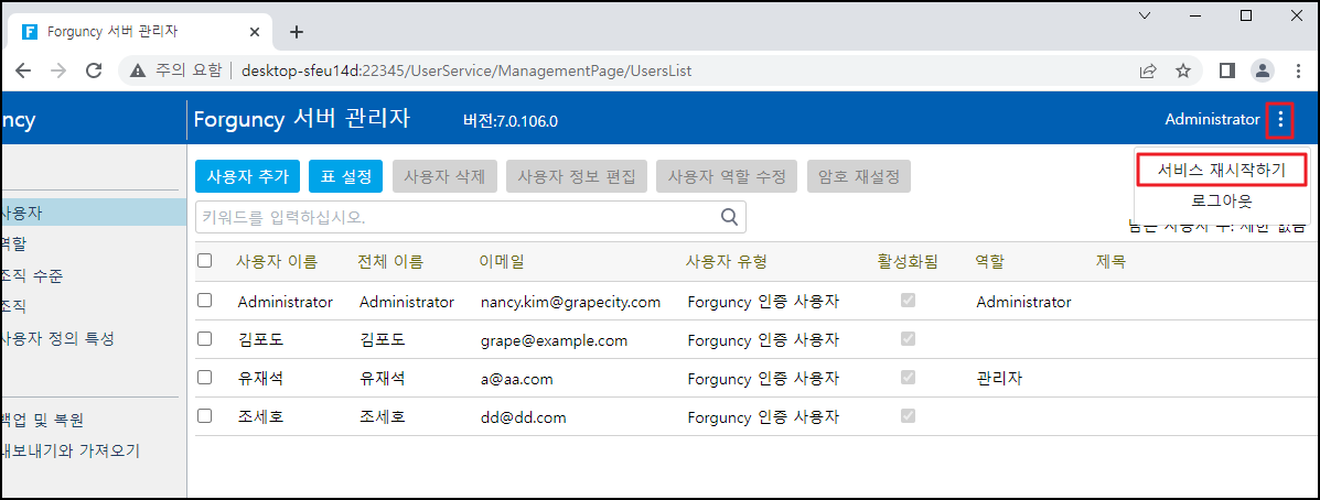 포건시에 알 수 없는 오류가 발생하거나 서비스를 다시 시작해야 하는 경우 관리 콘솔에서 직접 포건시 서비스를 다시 시작할 수 있습니다.&#x20;