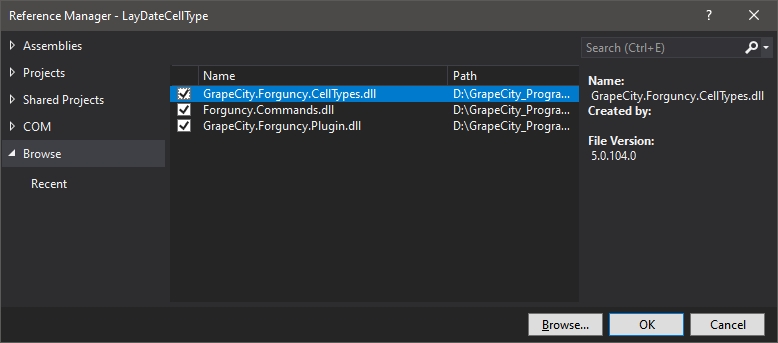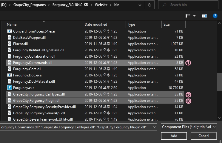 포건시 설치 위치에서 3개의 라이브러리 파일 GrapeCity.Forguncy.Plugin.dll, GrapeCity.Forguncy.CellTypes.dll, Forguncy.Commands.dll을 찾아 솔루션 탐색기에 추가하십시오.
