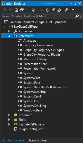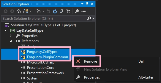 VS의 솔루션 탐색기(Solution Explorer)에서 “참고”를 확장하신 후, 나타나는 Forguncy.CellTypes 및 Forguncy.PluginCommon을 제거하십시오.
