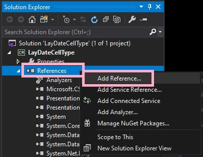 다시 솔루션 탐색기의 “참조”에서 마우스 오른쪽 클릭하여 “참조 추가(Add Reference)”를 선택하십시오.