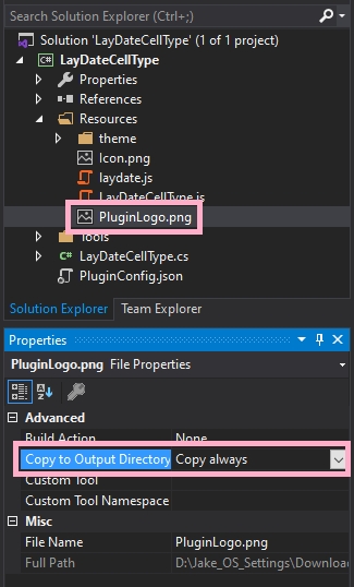 PluginLogo.png 파일의 속성창에서 “출력 디렉터리로 복사” 규칙을 “항상 복사”로 변경하십시오.