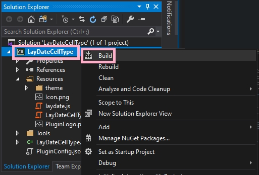 솔루션 탐색기에서 플러그인 이름을 마우스 오른쪽으로 클릭하신 후 “빌드(Build)”합니다.