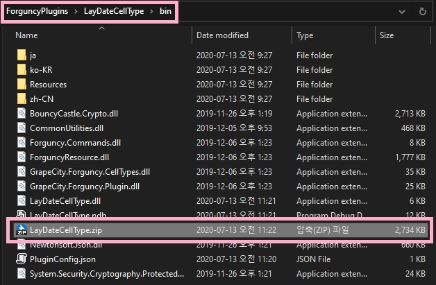 //포건시 셀유형 선택 시 왼쪽에 표시할 아이콘의 모양을 정의하는 부분입니다. [Icon("pack://application:,,,/LayDateCellType;component/Resources/Icon.png")] //셀에 표시할 기본값, 셀의 표시 모드의 선택, IReferenceFormular 등을 구현합니다. public class LayDateCellType : CellType, ISupportStyleInitialize, IReferenceFormula { //포건시 셀유형 선택 목록에 표시되는 이름을 정의합니다. public override string ToString() { return "LayDate달력"; } //포건시에서 셀유형 선택 시 오른쪽 패널에 나타날 옵션1을 정의합니다. [DisplayName("기본값")] [FormulaProperty] public object DefaultValue { get; set; } //포건시에서 셀유형 선택 시 오른쪽 패널에 나타날 옵션2를 정의합니다. [DisplayName("모드선택")] public LayDateMode LayDateMode { get; set; } //셀을 병합할 때 테두리가 남도록 합니다. public override DisplayBehaviour DisplayBehaviour { get { return DisplayBehaviour.KeepBorderWhenMerge; } } public Dictionary<StylePropertyName, object> GetDefaultStyleInfos(ICellInfo cellInfo) { var styles = new Dictionary<StylePropertyName, object>(); //LayDateCellType은 오른쪽 정렬이 기본입니다. styles.Add(StylePropertyName.HorizontalAlignment, ForguncyCellHorizontalAlignment.Right); return styles; } public IEnumerable<LocatedObject<object>> GetFormulaReferObjects(LocationIndicator location) { yield return new LocatedObject<object>(this.DefaultValue, location.AppendProperty("기본값")); } } //포건시에서 셀유형 선택 시 오른쪽 패널에 나타날 옵션2의 값들을 정의합니다. public enum LayDateMode { [Description("날짜")] Date, [Description("시간")] Time, [Description("날짜와 시간")] DateTime }다음 단계로는 웹에서 표현할 수 있는 JavaScript 작업을 해야 합니다. LayDate 한글화 버전 다운로드하고 theme 폴더와 laydate.js 파일을 Resources 폴더에 복사하십시오.