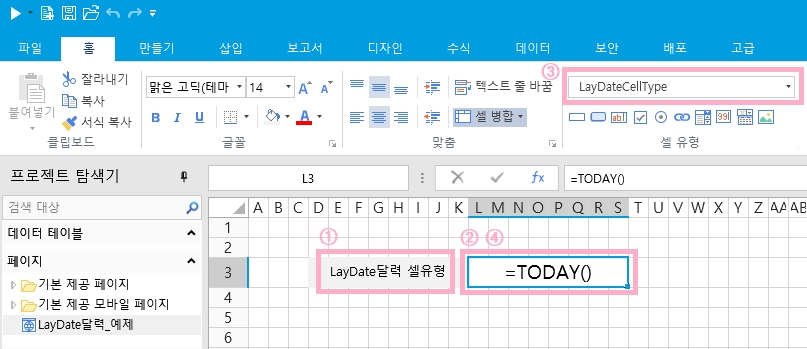 위 프로젝트를 간략히 설명하면 다음과 같습니다. ① 통합 셀을 만든 뒤 “LayDate달력 셀유형” 이라고 적고, 배경색을 회색으로 칠했습니다. ② 또 다른 통합 셀을 만들고, 까만색 테두리로 둘레를 표시 했습니다. ③ 생성한 통합 셀의 유형을 LayDateCellType으로 지정했습니다. ④ 셀의 기본 값을 오늘 날짜를 표시할 수 있도록 =TODAY()를 설정했습니다.