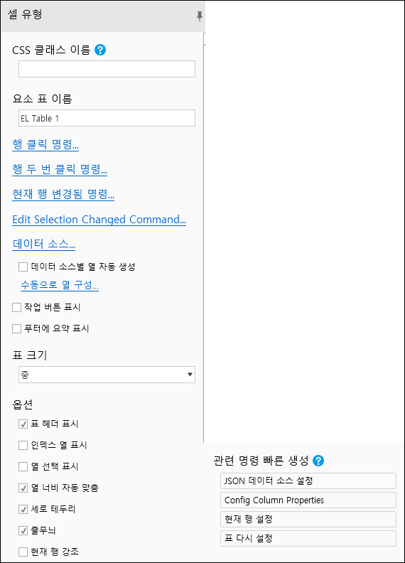<table><thead><tr><th width="239">이름 </th><th>설명 </th></tr></thead><tbody><tr><td>요소 표 이름 </td><td>표의 이름 </td></tr><tr><td>행클릭 명령 </td><td>표의 행 클릭 시 명령 </td></tr><tr><td>행 두번 클릭 명령 </td><td>표의 행을 두  번 클릭 시 명령 </td></tr><tr><td>현재 행 변경됨 명령 </td><td>표에서 현재 행이 바뀌었을 때의 명령 </td></tr><tr><td>Edit Selection Changed 명령 </td><td>표에서 현재 행이 바뀌었을 때의 명령 </td></tr><tr><td>데이터 소스 </td><td>표에서 사용할 데이터 소스를 설정 </td></tr><tr><td>데이터 소스별 열 자동생성 </td><td>설정한 데이터 소스를 표에서 자동으로 생성하는지의 여부 </td></tr><tr><td>수동으로 열 구성 </td><td><p>"데이터 소스에 의해 자동으로 열 생성" 옵션이 선택되지 않은 경우에만 작동합니다. 이 옵션은 일부 열 구성을 수동으로 수행하는 데 사용되며 설정은 다음과 같습니다.</p><ul><li>열 이름: 표시된 열 머리글 제목입니다.</li><li>데이터 소스의 열 이름: 로드하려는 데이터 소스의 열 데이터를 지정합니다.</li><li>서식 문자열: 날짜 유형 값을 일반 시간 문자열로 형식화합니다. 사용 가능한 옵션은 "yyyy/MM/dd" 및 "HH:mm"입니다.</li><li>열 너비: 테이블 열 머리글 포함.</li><li>열 최소 너비: 테이블 열 머리글 최소 너비입니다.</li><li>열 맞춤: 콘텐츠 정렬.</li><li>열 헤더 맞춤: 머리글 정렬.</li><li>정렬 활성화: 백엔드 정렬.</li><li>데이터 필터 활성화: 프런트 엔드 필터, 현재 페이지에만 적용됩니다.</li><li>다중 필터: 필터는 다중일 수 있습니다.</li><li>열 크기 조정 가능</li><li>오버플로 도구 설명 표시: 테이블 셀 내용이 너무 많아 포함할 수 없을 때 툴팁을 표시합니다.</li></ul></td></tr><tr><td>작업버튼표시 </td><td>테이블 열 끝에 작업 열을 추가할지 여부입니다. </td></tr><tr><td>작업 버튼 구성 </td><td>작업버튼표시를 체크해야 표시됨, 작업버튼의 유형과 이름, 스타일, 명령편집을 설정</td></tr><tr><td>작업 열의 너비 </td><td>작업 열의 너비 </td></tr><tr><td>푸터의 요약 표시 </td><td>푸터의 요약 표시를 체크하면 표 하단에 요약이 나옴 </td></tr><tr><td>요약 텍스트 </td><td>푸터의 요약 표시를 체크해야 표시되며, 요약의 텍스트를 나타냄</td></tr><tr><td>표 크기 </td><td>표의 크기를 대,중,소로 설정할 수 있음 </td></tr><tr><td>표 헤더 표시 </td><td>표 헤더를 표시할 지 여부 </td></tr><tr><td>인덱스 열 표시 </td><td>인덱스 열을 표시할 지 여부 </td></tr><tr><td>열 선택 표시 </td><td>열을 선택할 지 여부 </td></tr><tr><td>열 너비 자동 맞춤 </td><td>열을 자동으로 맞출 지 여부 </td></tr><tr><td>세로 테두리 </td><td>세로 테두리를 사용할 지 여부 </td></tr><tr><td>줄무늬 </td><td>줄무늬를 사용할 지 여부 </td></tr></tbody></table>