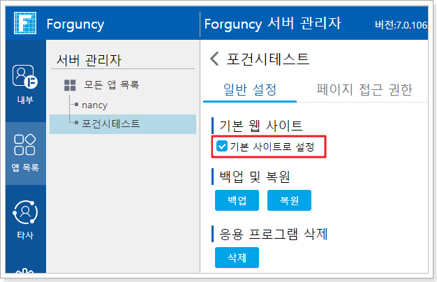 모든 앱 목록에서 기본 응용프로그램으로 설정을 선택 취소한 후 설정 저장을 클릭하여 기본 응용프로그램을 취소합니다. 응용프로그램 이름이 굵게 표시되지 않고 실행되면 URL이 http\:// *서버 이름*/*앱 이름으로* 돌아갑니다.