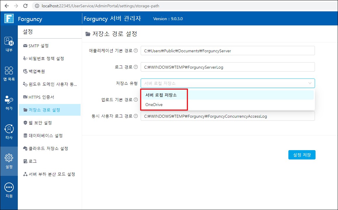 서버관리자에서 \[설정>클라우드 저장소 설정]을 선택하여 클라우드 저장소 설정 페이지로 들어갑니다.