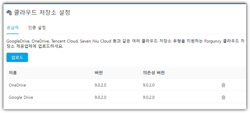 업로드가 완료되면 아래 목록에 공급자 이름, 버전 번호 및 의존성 버전 번호가 표시됩니다. ![](https://help.grapecity.com.cn/download/thumbnails/80953092/image2022-9-30_16-34-14.png?version=1\&modificationDate=1673923284000\&api=v2)버튼을   클릭하면 삭제할 수 있습니다.