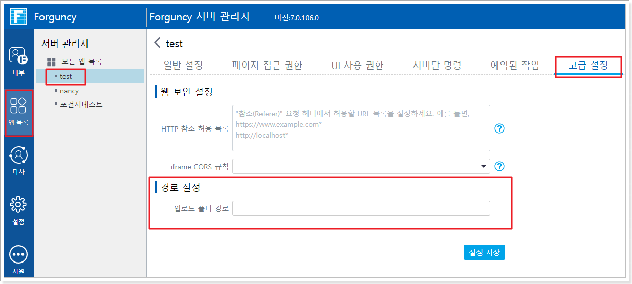 서버관리자에서 앱 관리를 클릭하고 첨부 파일 저장소 경로를 설정할 앱을 선택하고 고급 설정에서 첨부 파일 저장소 경로를 설정하고 설정이 완료되면 설정 저장을 클릭합니다.