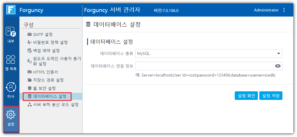 포건시의 서버관리자에서 설정-> 사용자 정보 데이터베이스 구성을 선택하여 사용자 정보 데이터베이스 구성 페이지로 이동합니다.