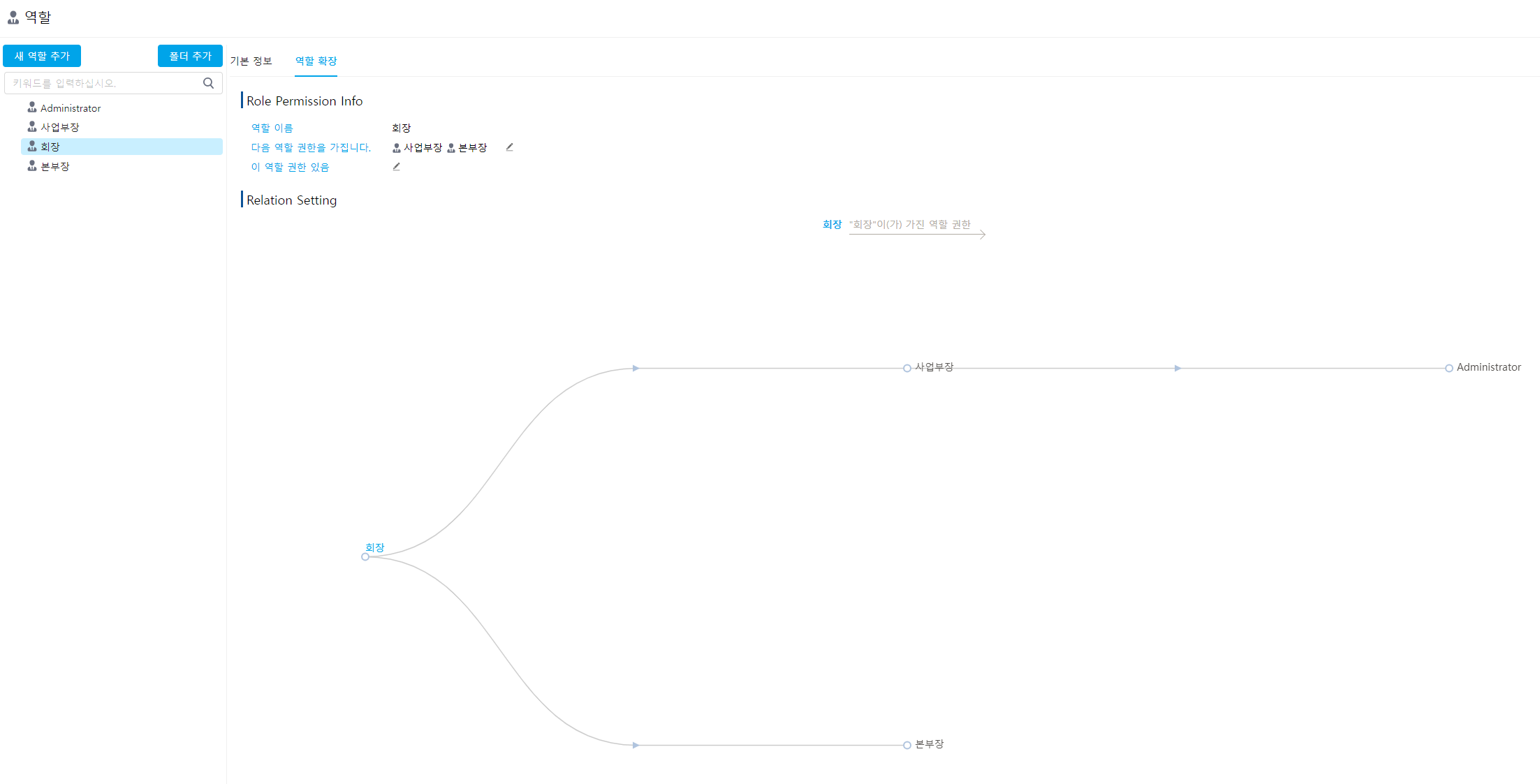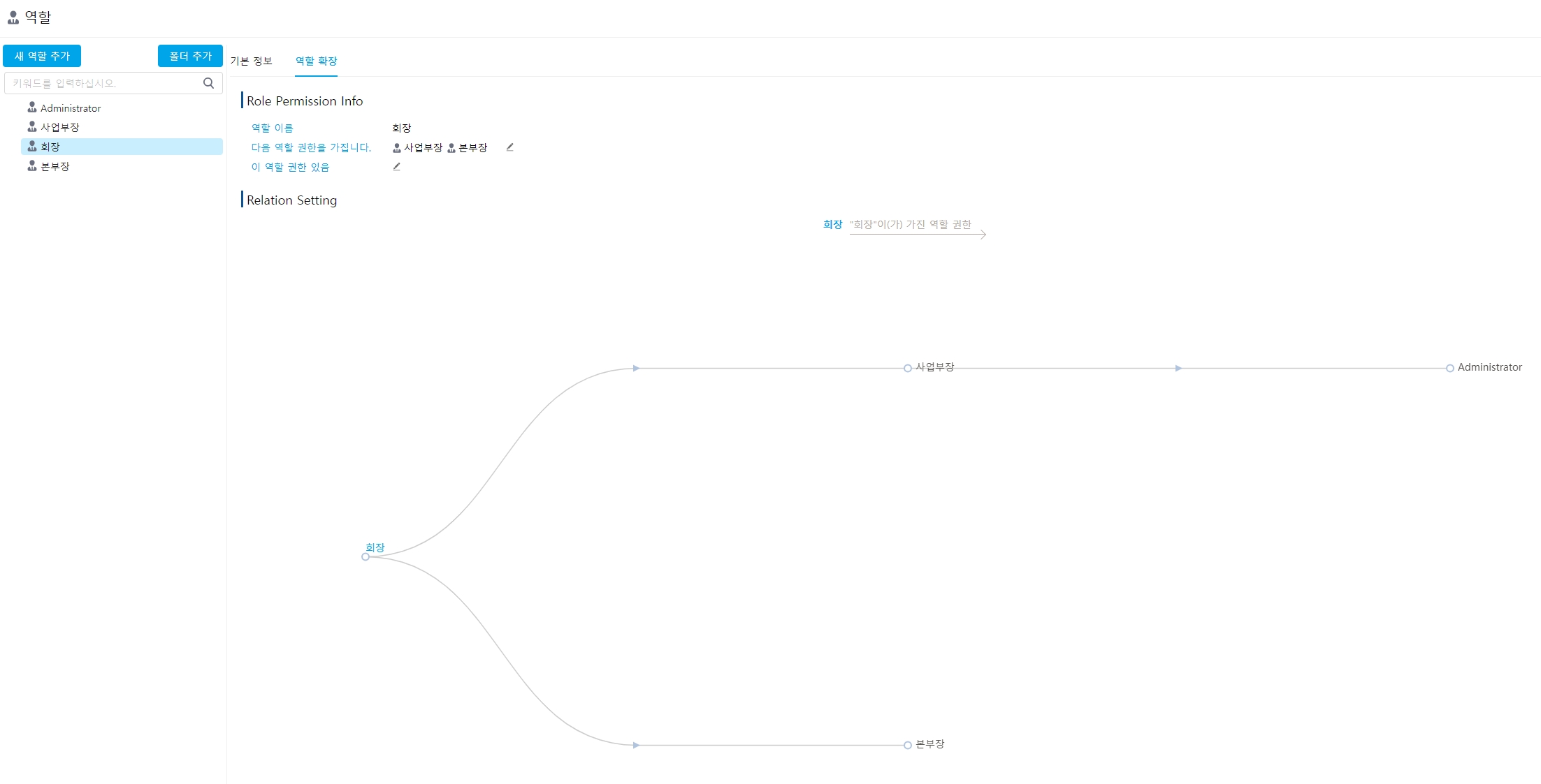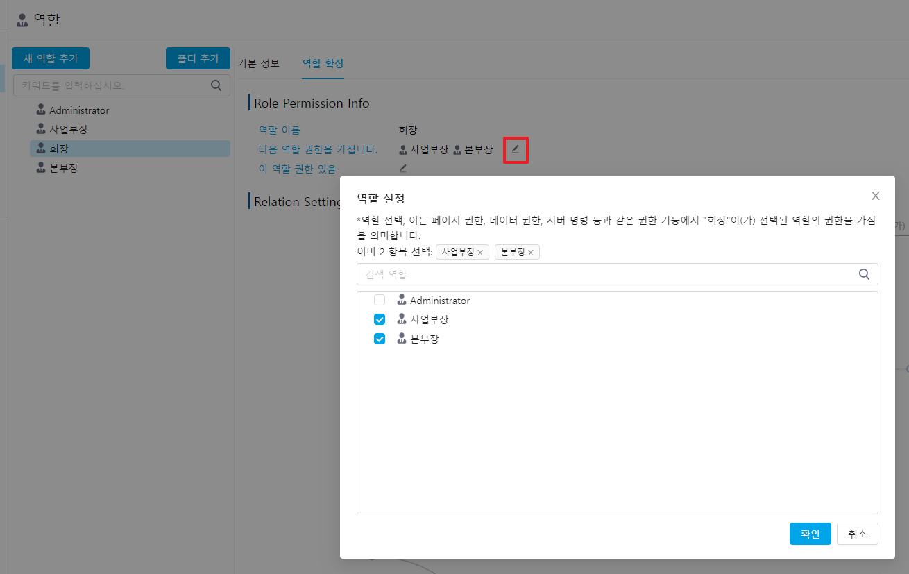 역할의 권한 관계에서 현재 역할의 역할 권한을 조회/설정할 수 있으며 현재 역할 권한을 가진 역할이 나열됩니다.