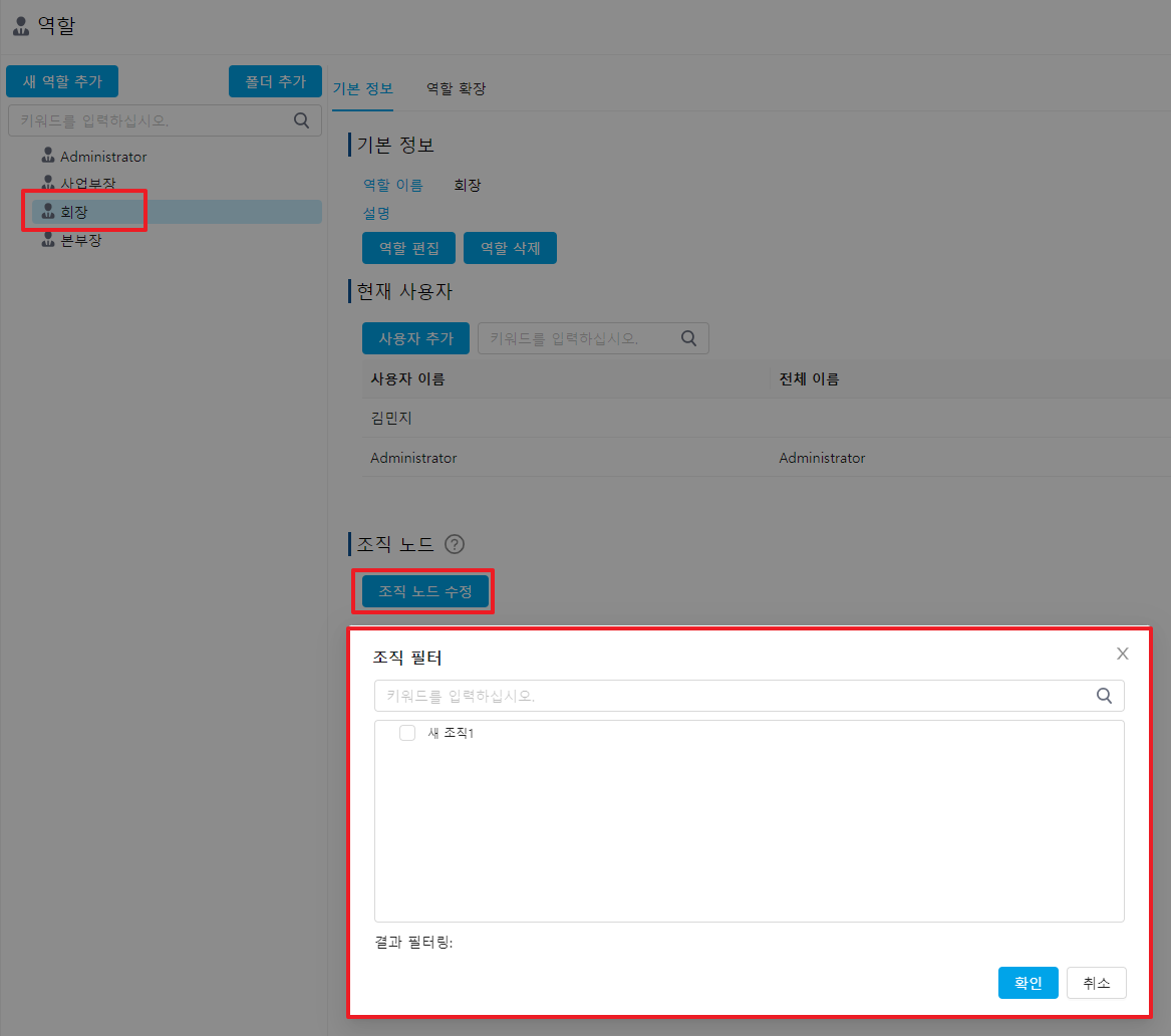 역할 선택 후 오른쪽 기본 정보의 조직 노드 영역에서 조직 노드 수정을 클릭합니다.