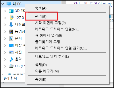 컴퓨터 또는 내 컴퓨터에서 마우스 오른쪽 버튼 클릭하고 관리를 선택합니다.