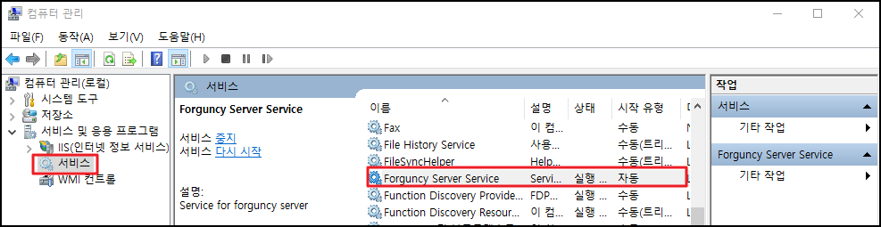 팝업 컴퓨터 관리자에서 서비스를 선택하고 서비스 목록에서 Forguncy Server Service를 찾아 상태가 시작됨 또는 실행 중인지, 시작 유형이 자동인지 확인합니다.