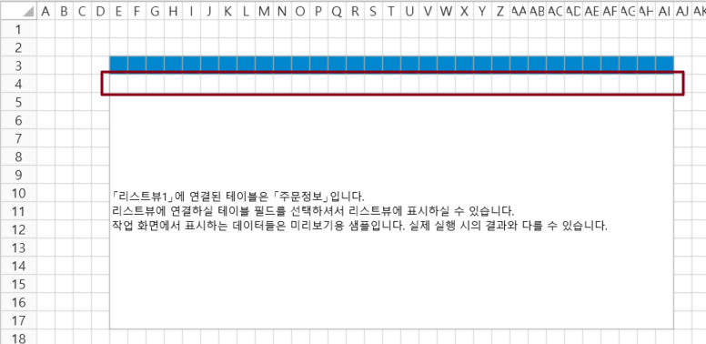 리스트뷰를 선택한 영역에 바인딩되면 선택한 영역이 테이블 디자인 영역입니다. 다음 그림과 같이 리스트뷰 디자인 영역의 두 번째 동작 템플릿 행입니다.
