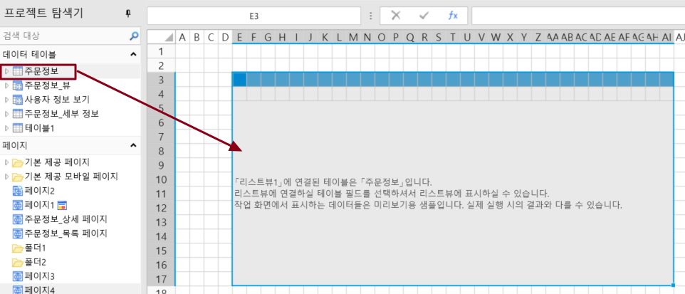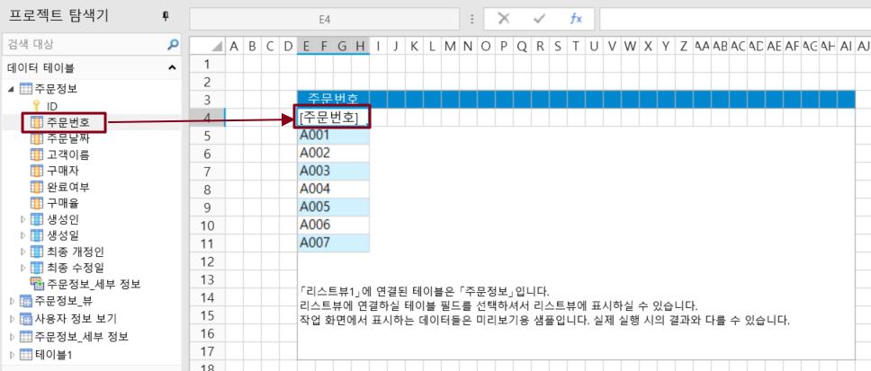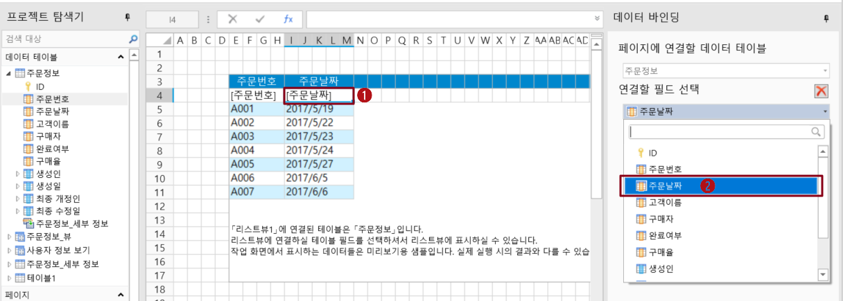 데이터 테이블을 선택하면 리스트뷰에 바인딩됩니다.