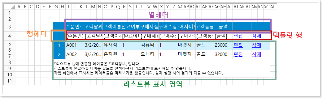 리스트뷰는 다음 그림과 같이 행 헤더, 열 헤, 템플릿 행 및 리스트뷰 자리 표시 영역으로 나뉩니다. 템플릿 행 셀의 너비는 결국 테이블 데이터 열의 너비로 사용되므로 템플릿 행 셀의 너비를 수정하거나 셀을 병합하여 데이터를 표시할 충분한 공간을 확보할 수 있습니다.