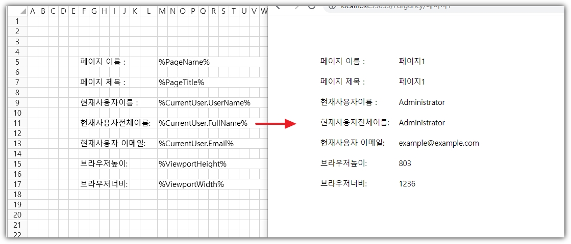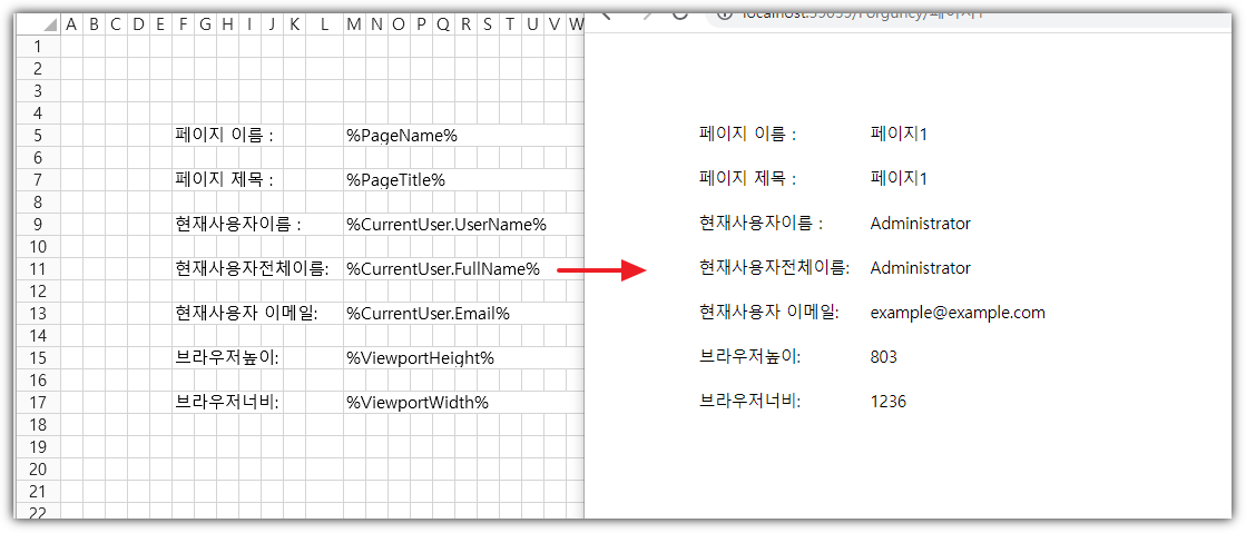 예를 들어 페이지에 키워드를 삽입하고 실행 후 로그인한 사용자의 페이지 이름과 속성 정보를 페이지에 표시할 수 있습니다.