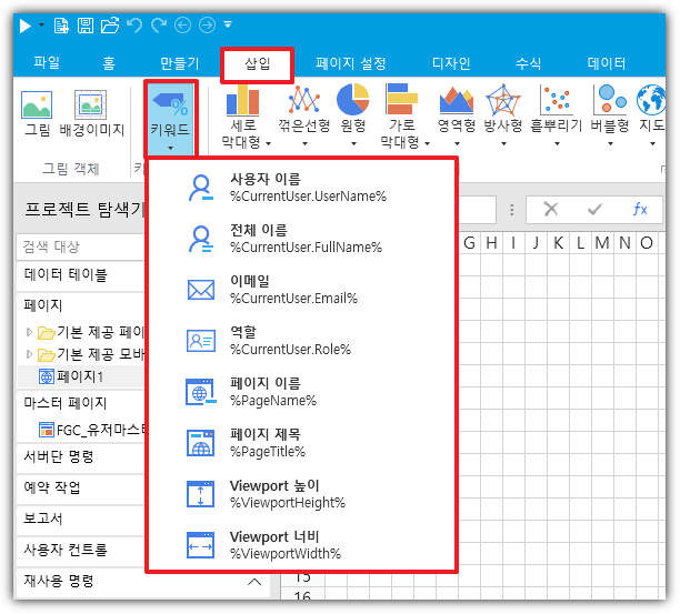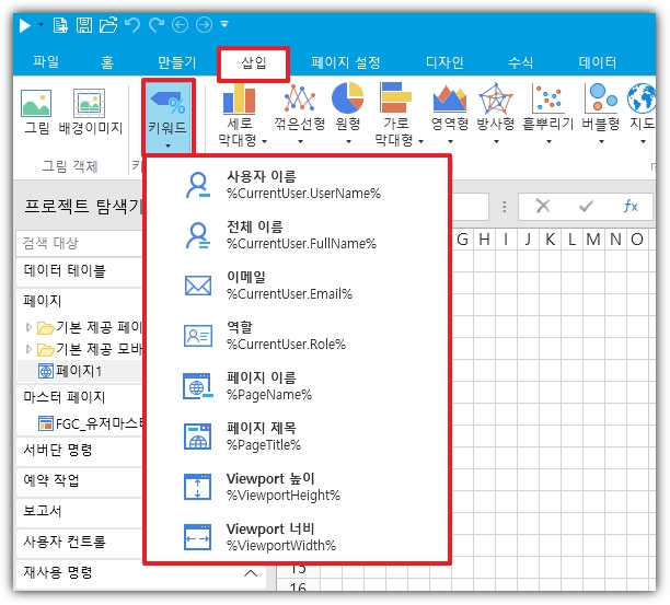 [삽입>키워드]를 선택하고 키워드 목록에서 키워드를 클릭하여 페이지에 키워드를 삽입할 수 있습니다.