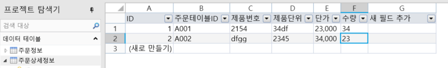 하위 테이블인 주문 세부 정보 테이블을 두 번 클릭하면 테이블이 열립니다.