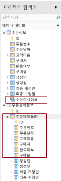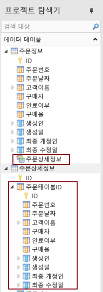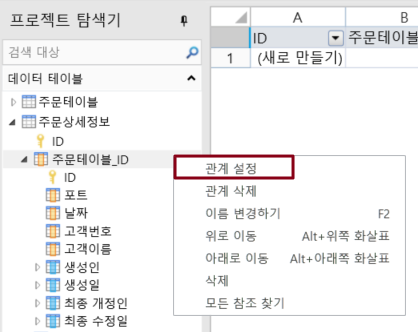다음은 주문정보 테이블과 주문 상세 정보 테이블을 예로 들어 마스터-하위 테이블을 직접 만드는 단계를 보여 줍니다.