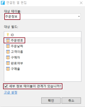 [연결된 열 편집] 대화 상자에서 [대상 테이블]은 [주문정보]를 선택하고, [대상 필드]는 [주문번호 ]를 선택하고 [세부 정보 테이블이 관계가 있습니까?] 선택합니다.