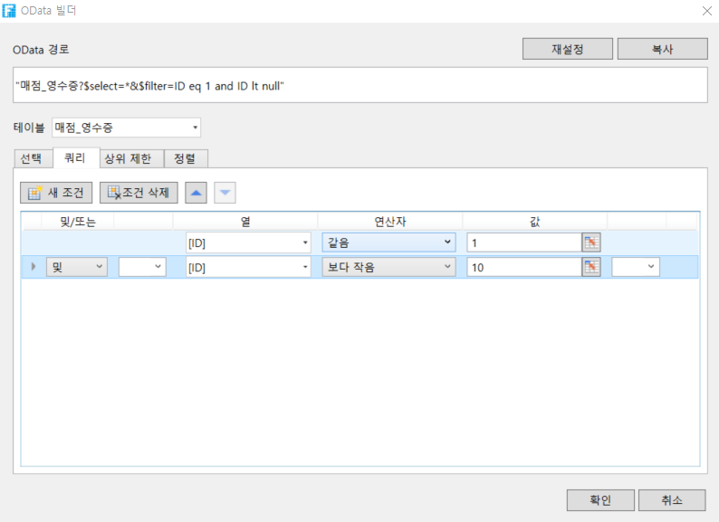 OData 생성기에서 데이터 테이블을 선택한 후 쿼리 조건을 설정하고 쿼리 조건에 따라 데이터 테이블에서 데이터를 필터링합니다.