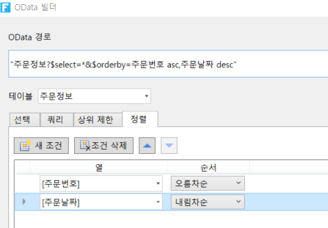 [정렬] 탭을 선택하고 [새 조건]을 클릭하고 데이터 테이블의 필드를 선택하고 선택한 필드의 오름차순 또는 내림차순 정렬에 따라 데이터를 정렬하는 방법을 설정합니다.