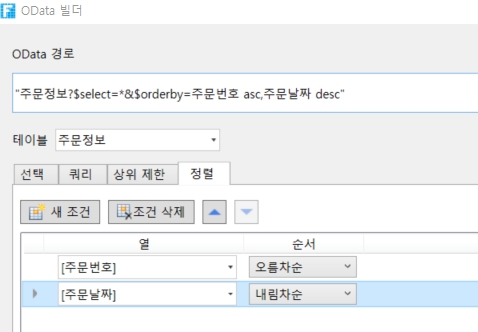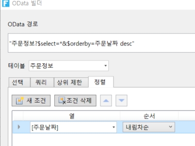데이터 정렬을 설정합니다. 예를 들어 주문 날짜를 내림차순으로 정렬합니다.