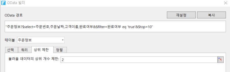 쿼리 행 수를 설정합니다. 예를 들어 쿼리 행 수가 2이면 처음 세 줄의 완료된 주문에 대한 레코드가 표시됩니다.