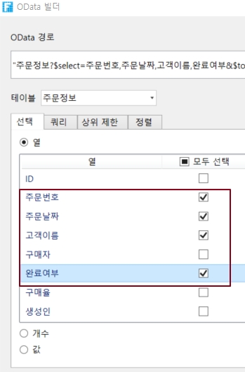 표시할 테이블과 열을 선택합니다. 예를 들어 테이블을 주문정보 테이블로 선택하고 열로 선택한 다음 주문번호, 주문날짜, 고객이름, 완료여부 선택합니다.