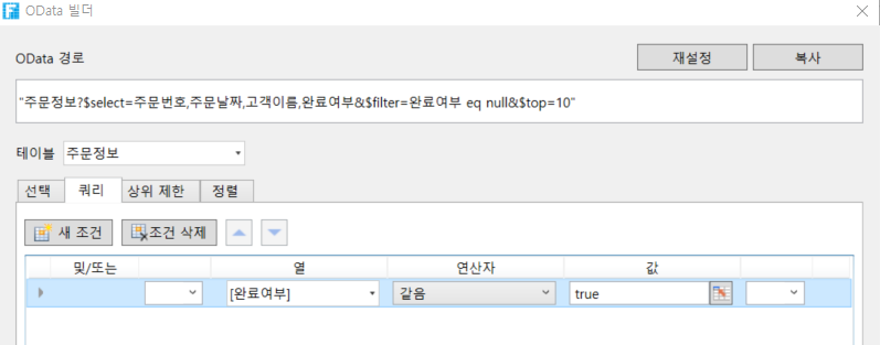 (선택 사항) 쿼리 조건을 설정합니다. 예를 들어 완료된 주문에 대한 레코드를 쿼리하려면 쿼리 조건이 완료 여부 필드가 true와 같도록 설정됩니다.