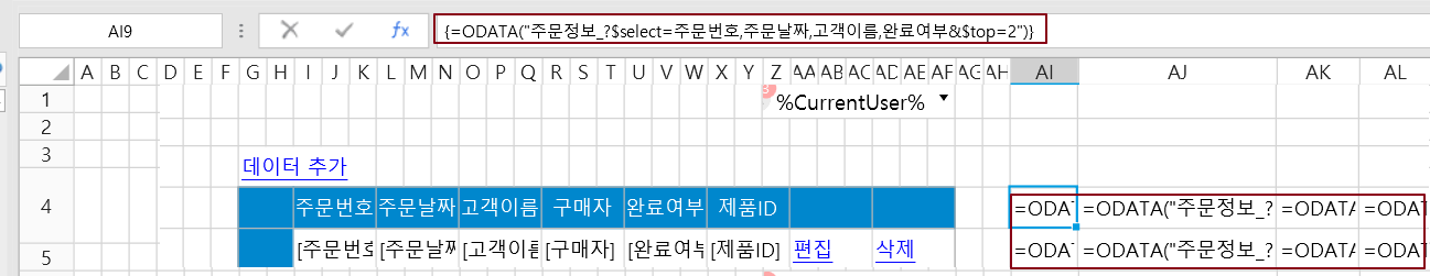 페이지에서 셀 범위를 선택하고 리본 메뉴 모음에서 [수식->OData 생성기]를 선택합니다.
