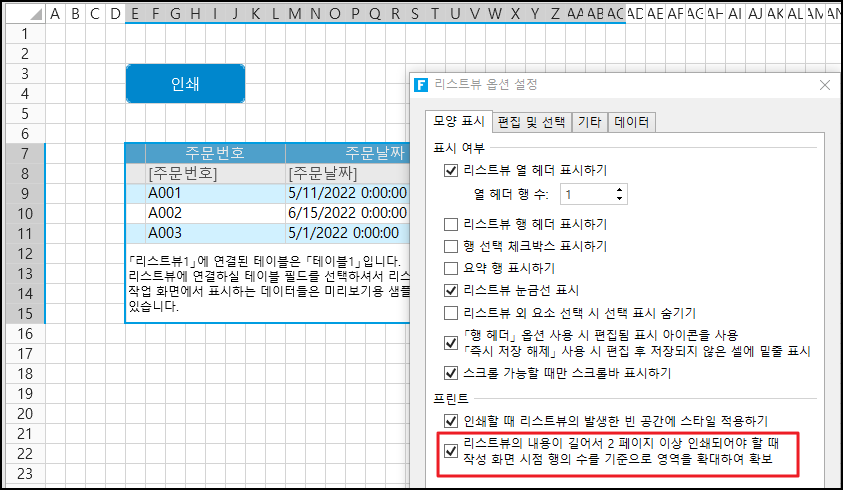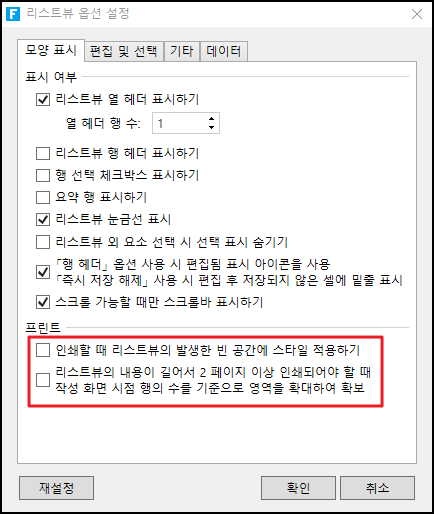 리스트뷰를 인쇄할 때 리스트뷰 인쇄하도록 설정할 수 있습니다.