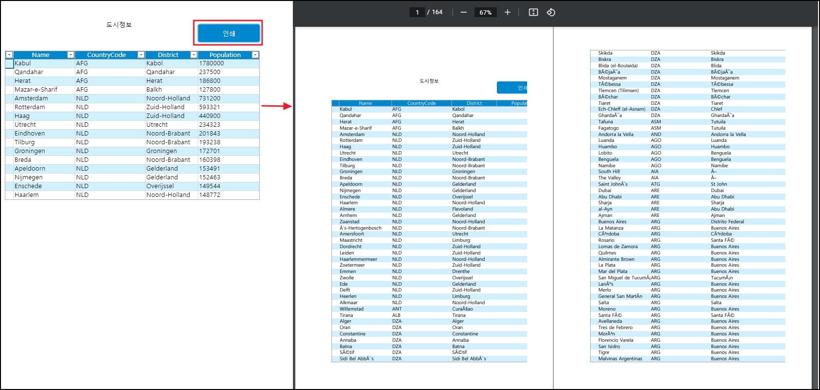 실행 후 페이지의 테이블 데이터가 모두 로드되지만 리스트 크기 제한으로 인해 완전히 표시되지 않습니다. [인쇄] 버튼을 클릭하면 리스트뷰가 PDF로 내보내지고 리스트뷰가 자동으로 확장되어 리스트뷰의 모든 데이터가 인쇄됩니다.