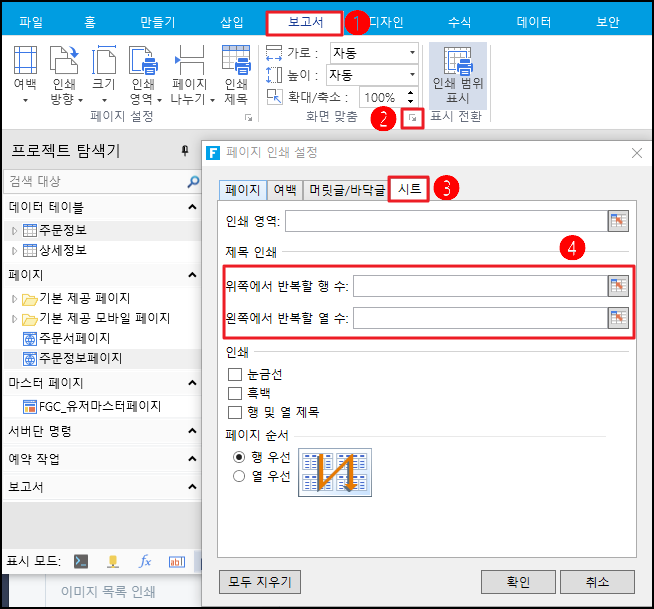 리본 메뉴 모음에서 [보고]를 선택하거나, 페이지 설정 대화 상자를 클릭하고, [페이지] 탭을 클릭하고, 인쇄 머리글 영역에서 맨 위 머리글 행과 왼쪽 머리글 열을 설정합니다.![]()