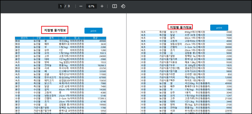 실행 후 인쇄 버튼을 클릭하여 페이지를 PDF로 내보내면 내보낸 페이지에 설정된 제목 열 내용이 각 페이지에 반복적으로 표시되는 것을 볼 수 있습니다.