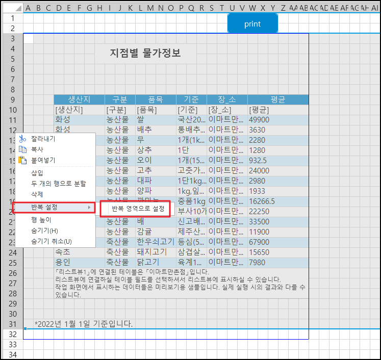 페이지에는 "페이지를 PDF 내보내기"라는 명령이 있는 인쇄 버튼이 있습니다. 페이지에서 반복 인쇄할 영역을 선택하고 행 인덱스 열을 마우스 오른쪽 버튼을 클릭한 다음 마우스 오른쪽 버튼 클릭 메뉴에서 반복 영역 [반복설정>반복 영역으로 설정]으로 설정 을 선택합니다.