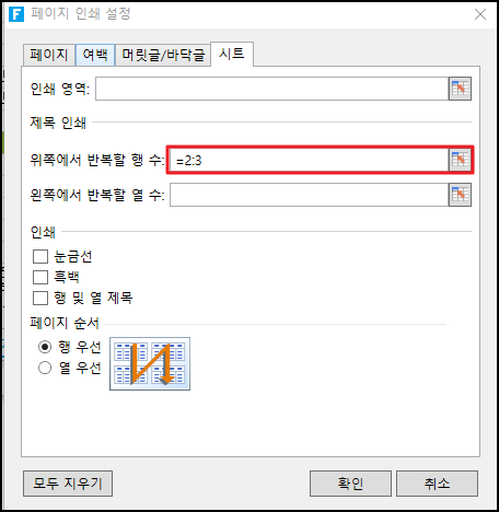 위쪽에서 반복할 행 수를 클릭한 후 페이지에서 반복할 머리글 행을 선택합니다.![]()