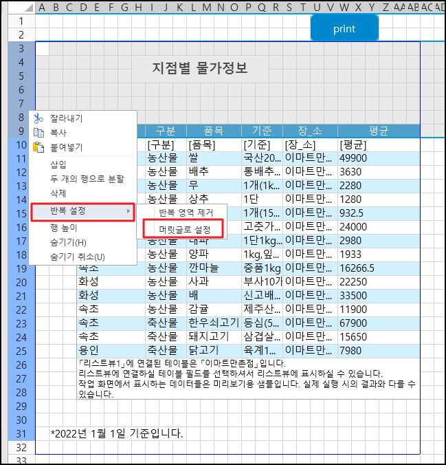반복 영역의 머리를 설정하고, 반복 영역의 맨 위에서 반복할 머리 영역을 선택하고 마우스 오른쪽 버튼을 클릭한 다음 오른쪽 클릭 메뉴에서 [반복 설정- > 머리글로 설정]을 선택합니다.