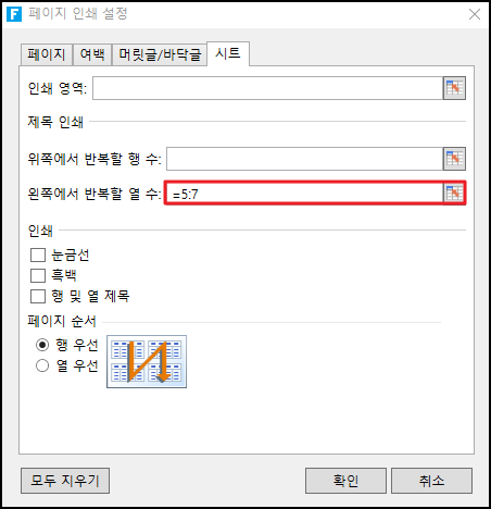 왼쪽 머리글 열 행을 클릭한 후 페이지에서 반복할 머리글 열을 선택합니다.![]()