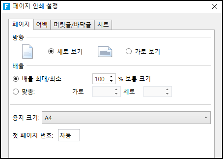 페이지 설정 대화 상자에서 [크기] 탭을 클릭하여 용지의 방향, 배율, 용지 크기 및 시작 페이지 번호를 설정할 수 있습니다