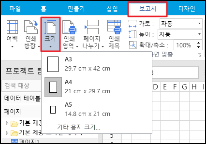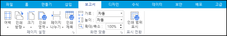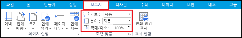 리본 메뉴 모음에서 보고서를 선택하여 적절한 크기 조정 영역에서 직접 너비, 높이 및 배율을 설정할 수도 있습니다.