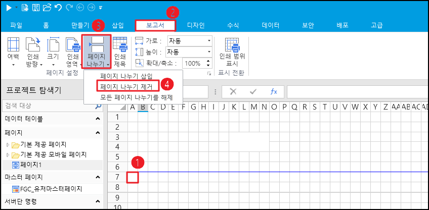 페이지 나누기 아래의 셀을 선택하고 리본 메뉴 모음에서 [인쇄-> 페이지 나누기-> 페이지 나누기 제거]를 선택합니다.