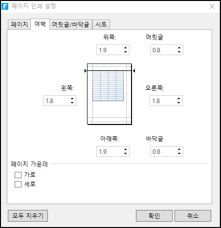 페이지 설정 대화 상자에서 [머리글/바닥글] 탭을 눌러 페이지의 머리글과 바닥글을 설정할 수 있습니다.