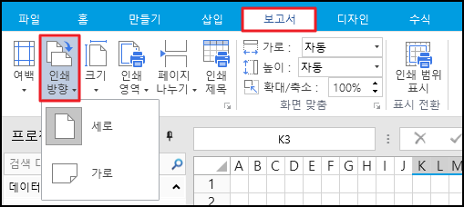 세로 또는 가로를 선택합니다. 리본 메뉴 모음에서 인쇄를 선택하고 용지 방향의 드롭다운 버튼을 클릭하여 세로 또는 가로를 직접 선택할 수도 있습니다.