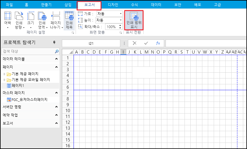 리본 메뉴 모음에서 [인쇄-> 인쇄 범위 표시]를 선택하면 인쇄된 영역인 실선과 파선, 가로 및 세로 페이지 나누기가 있는 실선 및 파선이 포함됩니다. 세로 페이지 나누기는 포건시에 자동으로 추가된 페이지 나누기입니다.