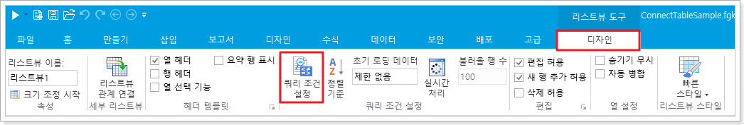 리스트뷰를 선택하고 리본 메뉴 모음에서 [리스트뷰 도구-디자인-> 쿼리 조건 설정]을 선택합니다.