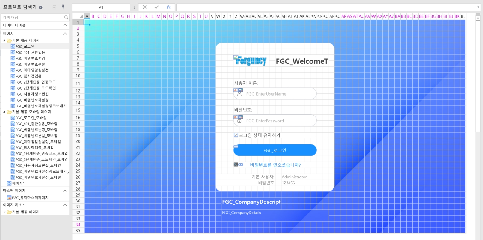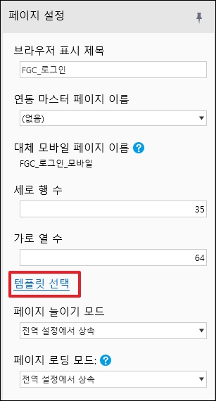 속성 설정 영역에서 "FGC_로그인 페이지"의 템플릿을 변경할 수 있습니다.