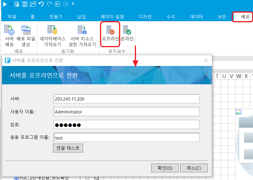 "배포 -> 오프라인"을 선택하여 서버를 일시 중단합니다.